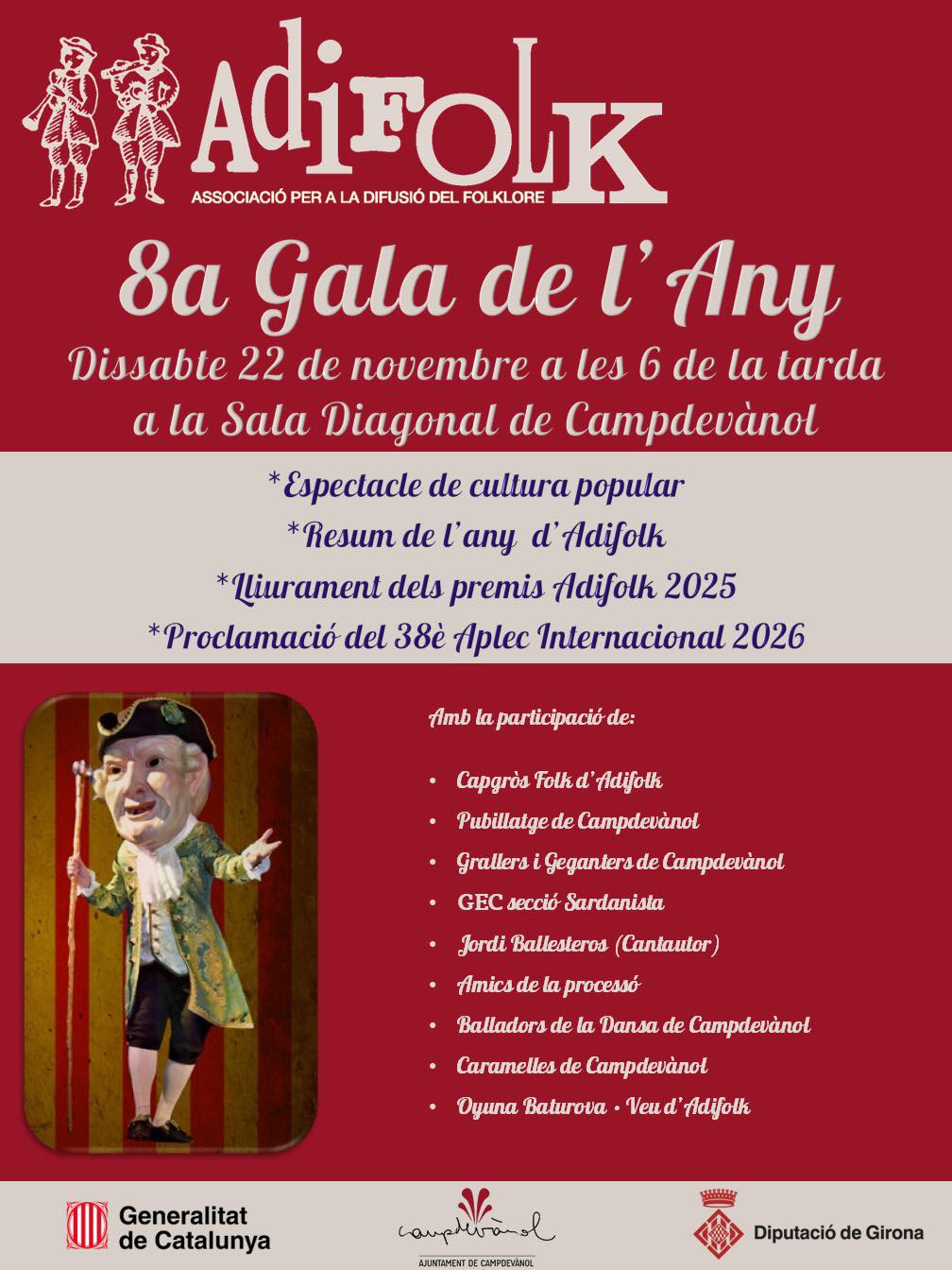 La Gala de l'Any és un moment de fer balanç i posar en valor la tasca dels grups i federacions que han participat en les principals activitats que ha impulsat Adifolk durant l’any. En l'acte es lliuraran els Premis Adifolk i s’anunciarà el municipi que acollirà la pròxima edició de l’Aplec Internacional. Abans hi haurà actes de cultura popular al carrer. Les entrades a l’acte són gratuïtes amb reserva prèvia. Es podran recollir a partir de dilluns dia 17 de novembre a l’Oficina d’Atenció Ciutadana de l’Ajuntament.