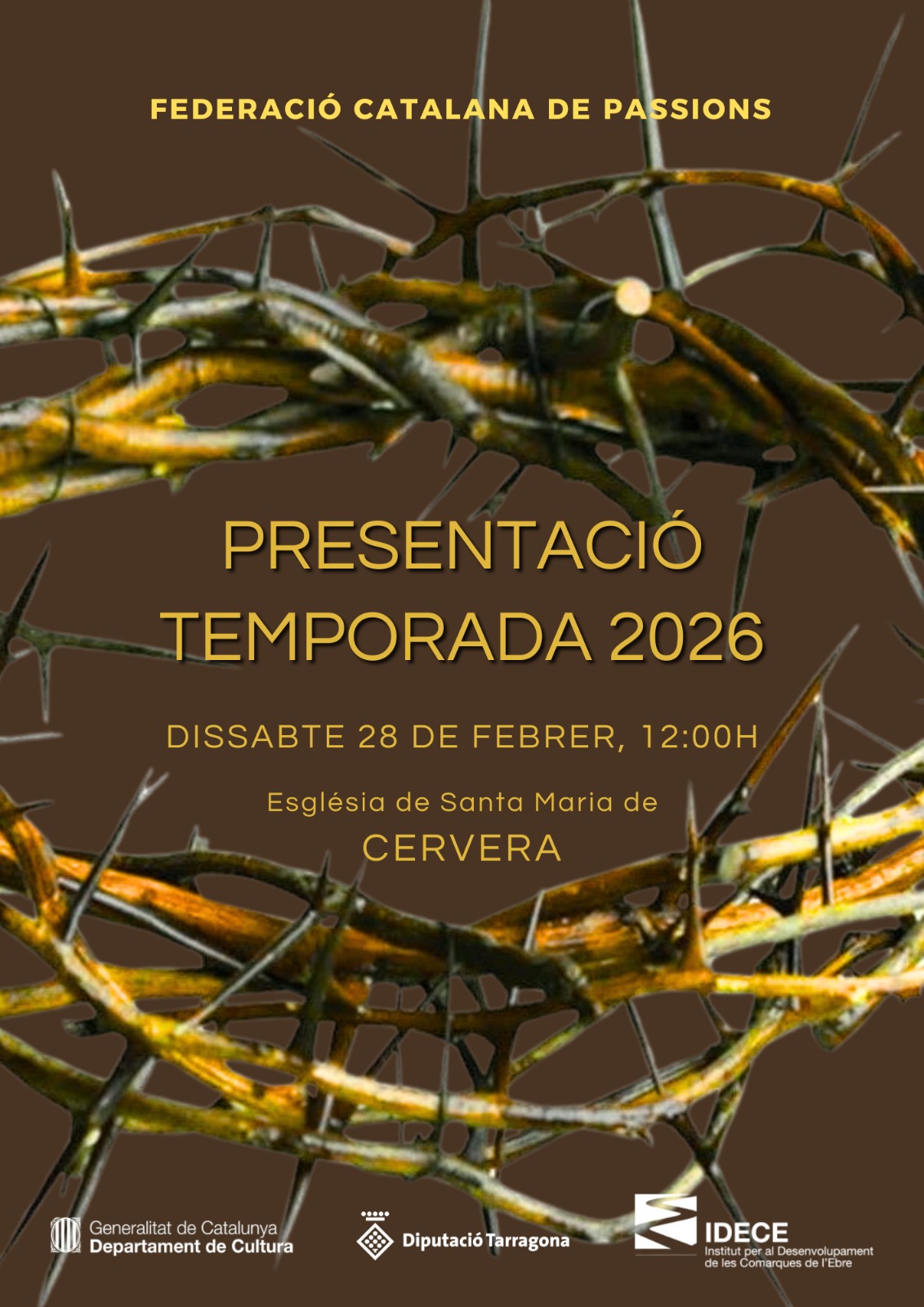 L’acte institucional serà al migdia a l’Església de Santa Maria. A la tarda es farà la la representació de la Passió de Cervera amb la participació d’actors i actrius procedents de les 22 Passions federades.